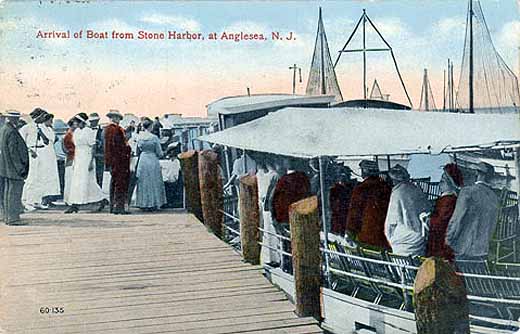 Anglesea, NJ - The arrival of the boat from Stone Harbor. As persons who browse the Cape County and Atlantic County sections will notice, the shore towns were, in the early 20th century, connected by steam boadt service as well as by railroad.