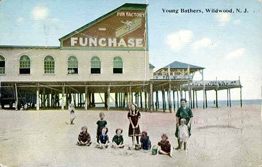 Kids on the beach by Funchase Pier in Wildwood, NJ around 1913